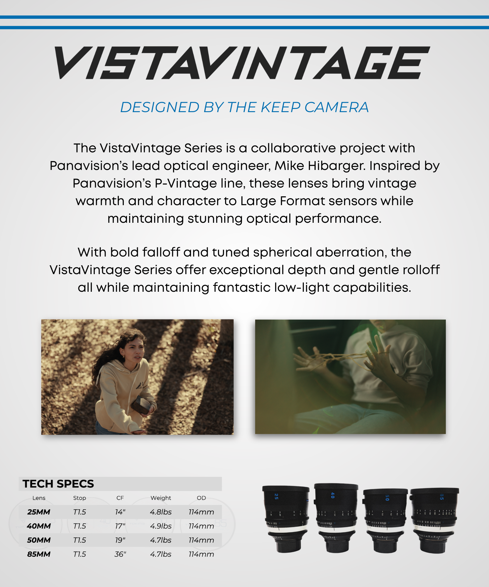 The VistaVintage Series is a collaborative project with Panavision’s lead optical engineer, Mike Hibarger. Inspired by Panavision’s P-Vintage line, these lenses bring vintage warmth and character to Large Format sensors while maintaining stunning optical performance. With bold falloff and tuned spherical aberration, the VistaVintage Series offer exceptional depth and gentle rolloff all while maintaining fantastic low-light capabilities.